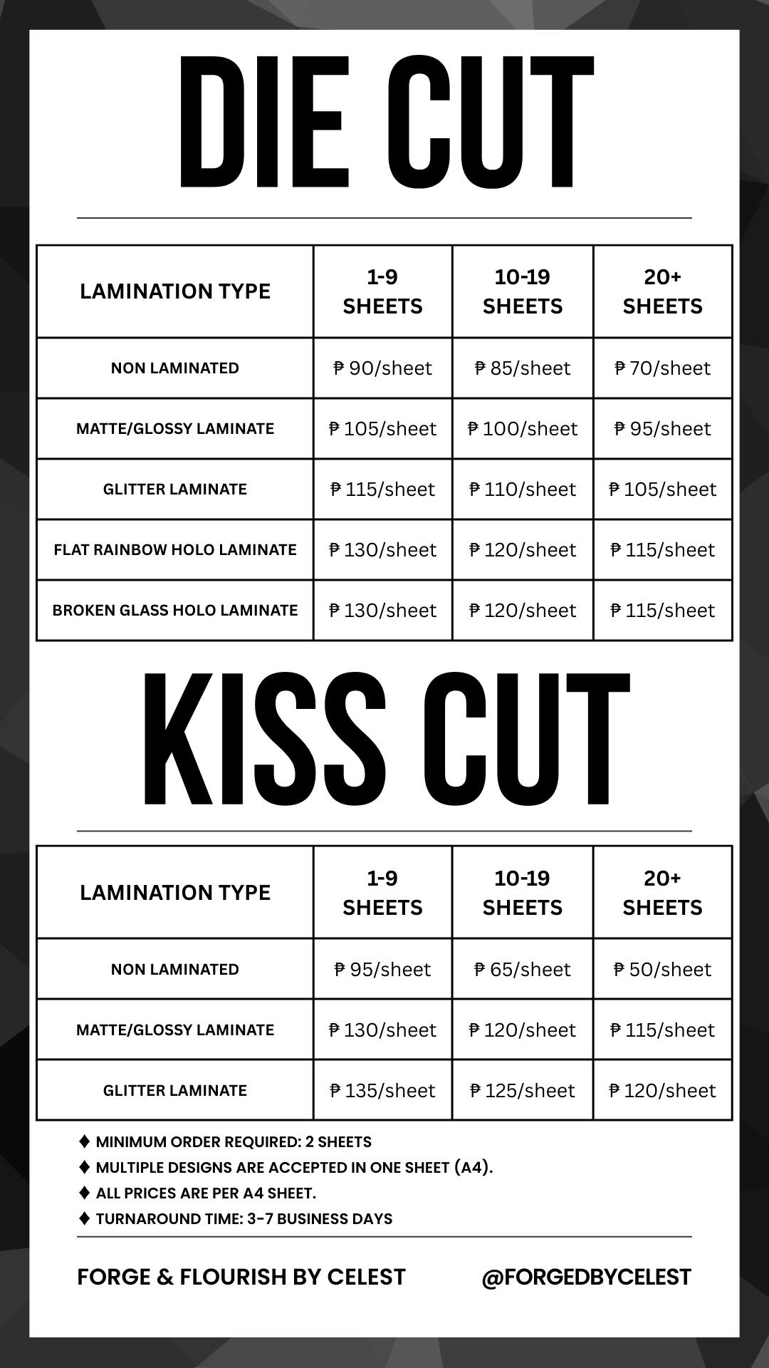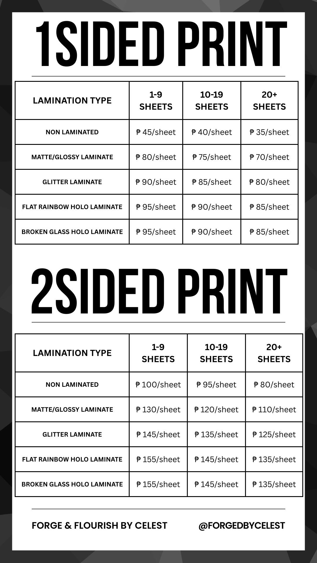**OPTIONAL: BACK LAMINATION ADD-ONS **By default, lamination only applies to the front of your print.If you'd like both sides laminated, here's the additional cost per sheet based on your chosen back finish:
